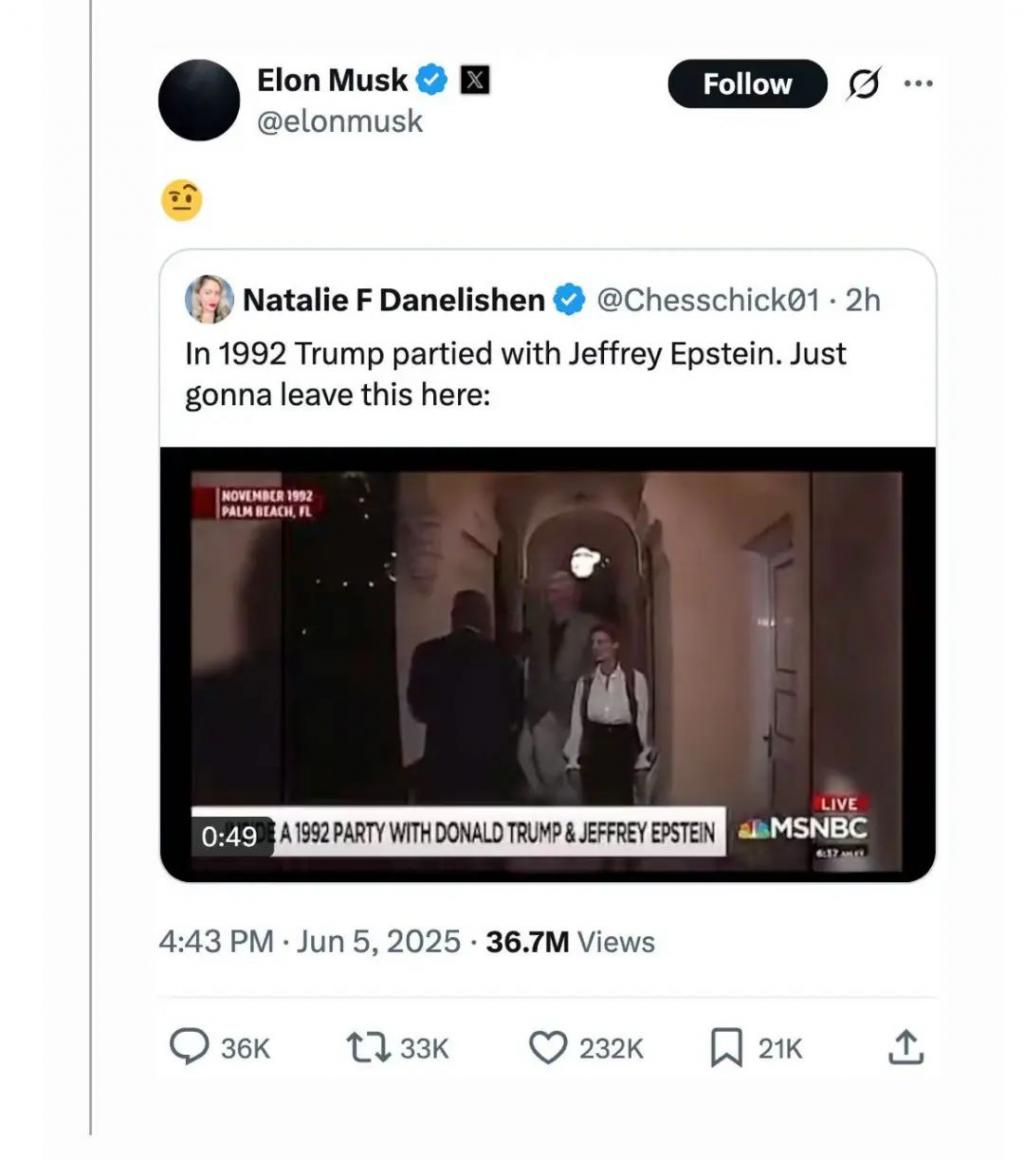 马斯克分享了一个视频,暗示特朗普和爱泼斯坦私交颇深。