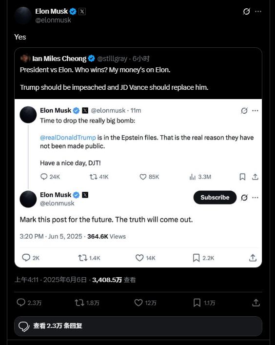 马来西亚右翼作家 Ian Miles Cheong 周四在 X 上发帖称," 总统 vs 埃隆。谁会赢?我赌埃隆赢。特朗普应该被弹劾,万斯应该取代他。" 马斯克随后转发并评论说:" 没错。"