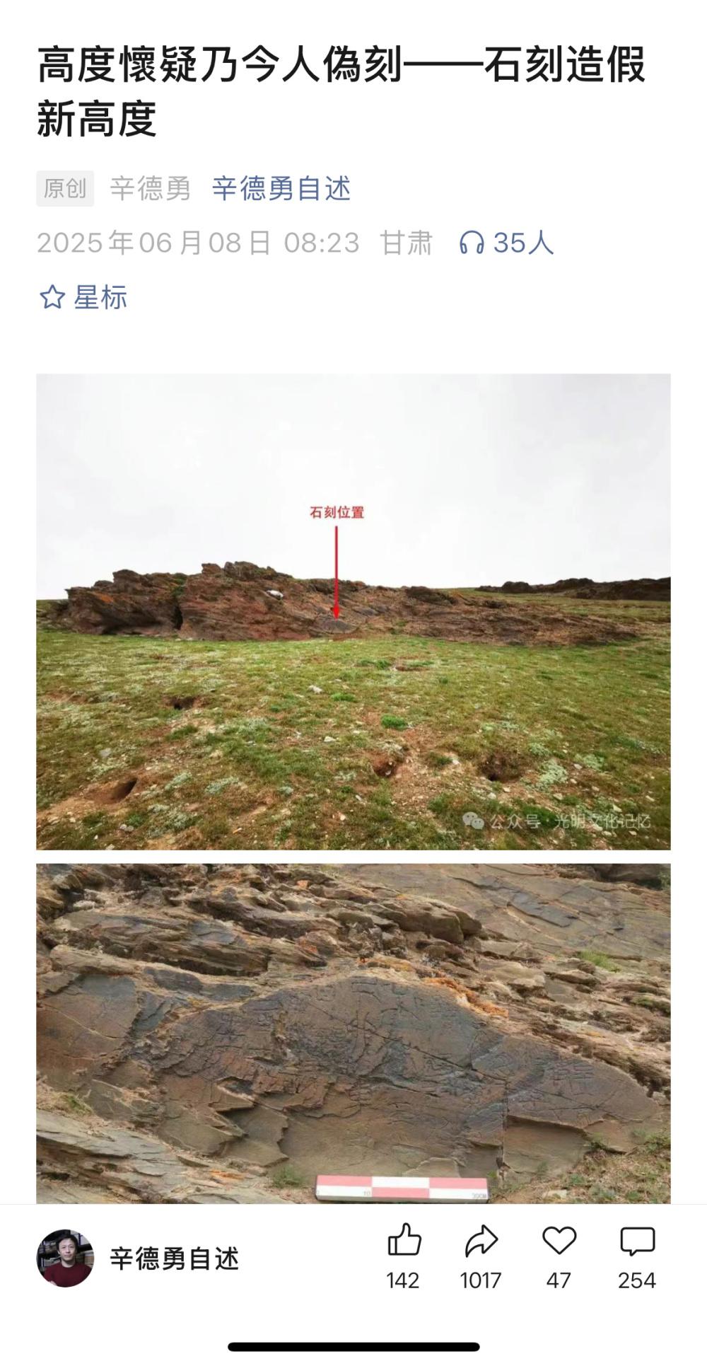 6 月 8 日,北京大学历史学系教授辛德勇在公号上发文《高度怀疑乃今人伪刻——石刻造假新高度》。" 铭文若如释文所释,敝人高度怀疑乃今人伪刻,这是石刻造假新‘高度’。"