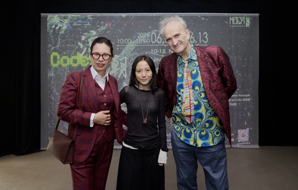 策展人在现场。左起:上海当代艺术馆执行馆长孙文倩, 伦敦金史密斯学院戏剧表演博士学位、多媒体实践艺术家郑悦, 国际知名的生成艺术家金史密斯学院教授William Latham