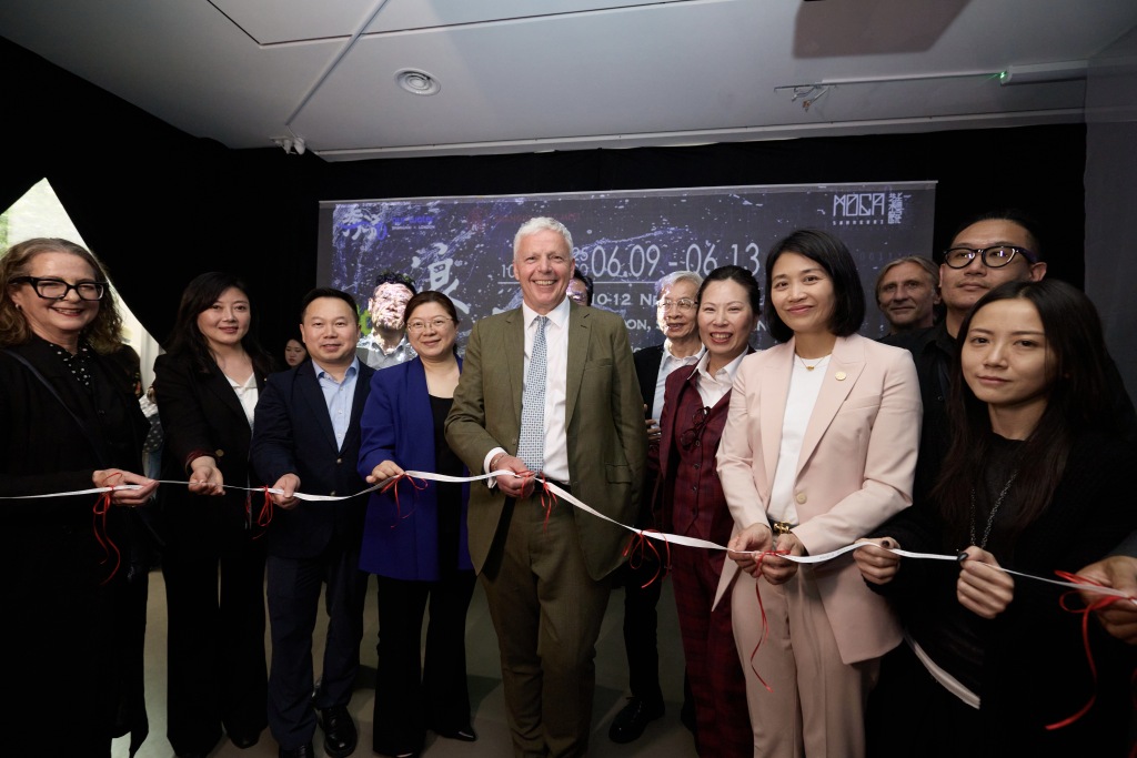Goldsmiths校长Frances Corner, 上海市对外文化交流协会处长杨焱,澎湃新闻总裁、总编辑刘永钢,上海新民晚报社社长刘可,Goldsmiths副校长David Oswell,MoCA Shanghai 馆长龚明光,MoCA Shanghai 执行馆长孙文倩,上海市政府新闻办主任陈怡群, 艺术家 David Cotterrell, 艺术家曹雨西, 策展人郑悦等(从左至右)中英嘉宾们将象征双城河流的双色丝带捆绑链接,共同合影庆祝展览开幕。
