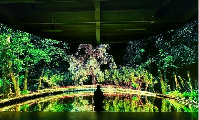顺流而下即为环境生态区:David Cotterrell 创作的全息影像将观众带入河流生态系统的呼吸之中;曹雨西的《四时比邻》通过人工智能的三维扫描,捕捉多座城市的植被风貌,以环境数据编织出诗意的数字花园。杨泳梁的《月光系列》将现代大都市转译成宋代山水画一般的景观,山水、都市与月光相互叠印,借诗意的视觉语言探讨城市化进程对生态的复杂影响。吕斯思则将苏格兰织布机的节拍转化为数据乐谱,在工业残响与数字节奏的交叠中探寻时间的褶皱。