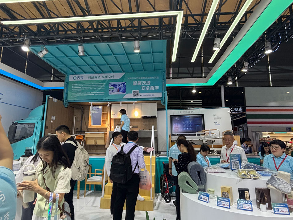 当日记者还看到,一辆特别的卡车开进了上海老博会的场馆,这是上海天与养老服务有限公司创新研发的智慧适老化改造全场景体验车“银龄智慧方舟”。工作人员赵玉娟介绍,卡车长约5.9米,车厢展开面积达到约15平方米,一辆卡车车厢分成了卧室、厨房、洗手间、淋浴间,集场景化体验、智能化产品交互与全链条服务于一体,展示了老人在居家场景下有哪些适老化改造可以做。这辆车已开到了江苏常州等地进行展示,“这样送到眼前的展示,破解了老年人居家改造‘认知难、选择难、体验难’的痛点。” 赵玉娟说,每次车开出去,来问来看的老人都很多,签单量也不少。目前这台车也已被多个政企平台预约,需求很多,排期排到了8月份,“不过老博会是一个重要的展示平台,我们一定会来。”