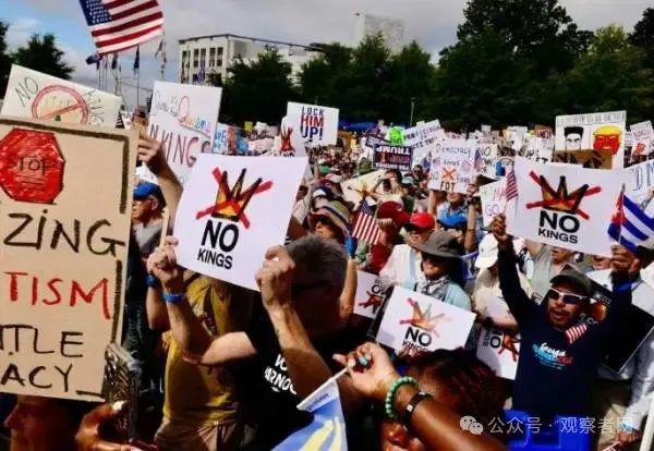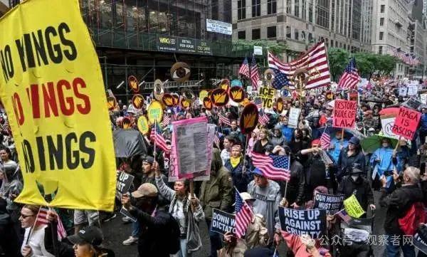 大批美国民众走上街头高呼着 " 不要国王 "(No Kings)的口号,通过悬挂特朗普木偶、倒插美国国旗等方式,宣泄着对特朗普驱赶移民等一系列政策的不满。