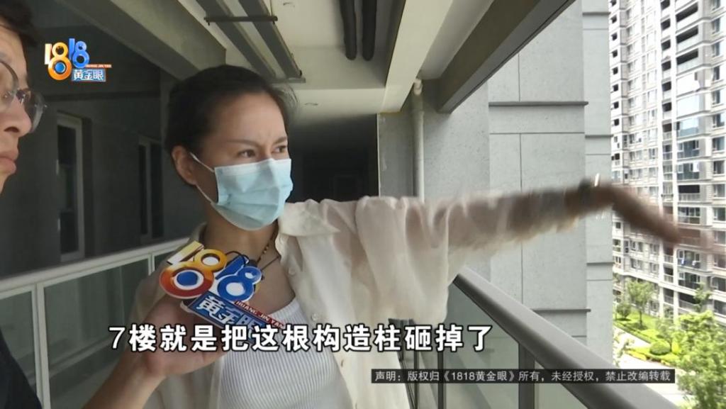 陶女士:从这边看过去,每个阳台都有一根柱子。7 楼就是把这根构造柱砸掉了。