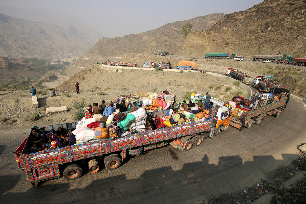 当地时间2025年4月23日,巴基斯坦托尔哈姆附近,载有阿富汗难民及其随身物品的卡车驶过巴阿边界。