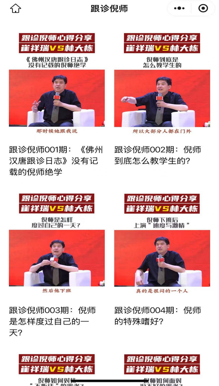 问止中医还成立了精一书院作为中医社区,截至2024年9月30日,精一书院已累计拥有超过22万名注册社区成员。打开精一书院小程序,里面有学习专区及各类班级,以及林大栋的个人课堂。林大栋师从倪海厦,在精一书院小程序中还能看到“跟诊倪师”系列视频。不过,前述患者表示:“没有林大栋的号了,他似乎不坐诊了。”