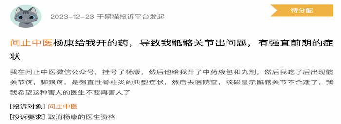 一名曾经在问止中医就医的肾结石患者表示:“自己已经吃了几个月的药了,前后花了六七千块钱,目前还没有任何迹象。”问止中医也时有收到客户投诉,黑猫投诉官网也有消费者反馈服药后出现身体不适的情况。
