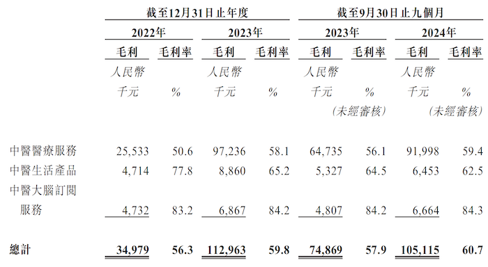问止中医的销售成本主要是医药及其他产品成本、人工成本以及线下诊所、煎药中心租赁费用及设备折旧、物流成本等。因此,公司录得较高毛利率,报告期综合毛利率分别高达56.3%、59.8%和60.7%,其中中医医疗服务毛利率最低,生活产品其次,中医大脑订阅服务最高。