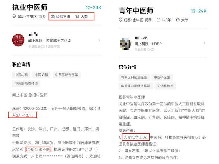 招股书显示,截至2024年9月30日,公司有83名毕业于知名中医大学或中医院校的全职医师,其中24人专治癌重症以及疑难症,59人为全科医生。界面新闻记者注意到,问止中医在小红书、BOSS直聘等平台上招聘青年医师,所给的薪资待遇都比较高,有部分岗位对医师要求仅限于“大专及以上”,甚至不限工作经验,不过均要求必须具备执业医师资格证。