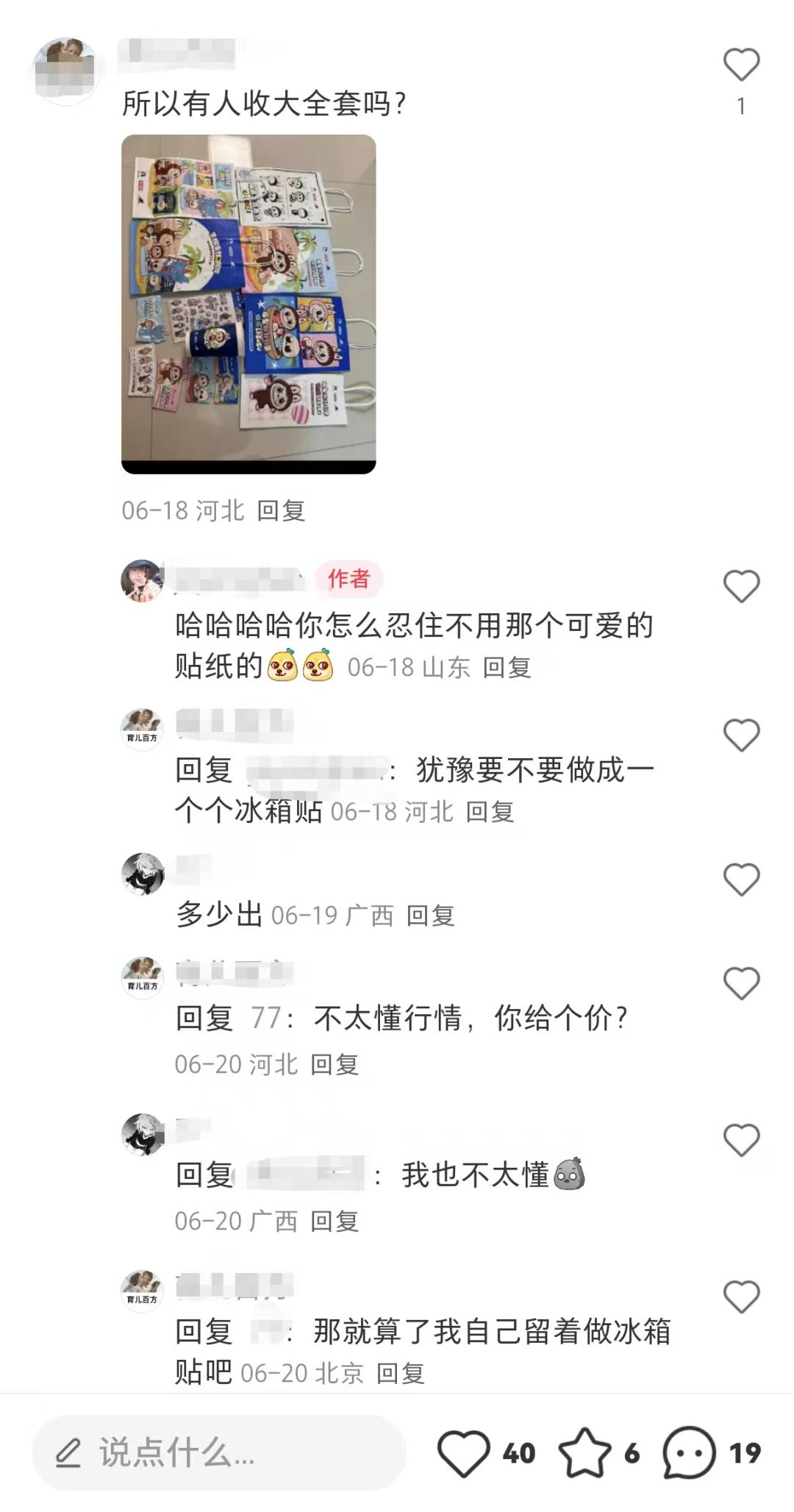 这种对收藏价值的讨论在大众语境里往往是混杂的。6月初,龙家升原版LABUBU在佳士得拍卖出108万的高价,这一价格来自艺术拍卖体系,对LABUBU的定义是艺术雕塑。但在大众舆论场中,其被与搪胶毛绒等消费品混为一谈,收藏价值不聚焦于某一产品,而被赋予给整个LABUBU IP。在小红书,一些网友甚至贴出被使用过的瑞幸联名贴纸,半开玩笑地问贴纸开价5000元是否有人会买。