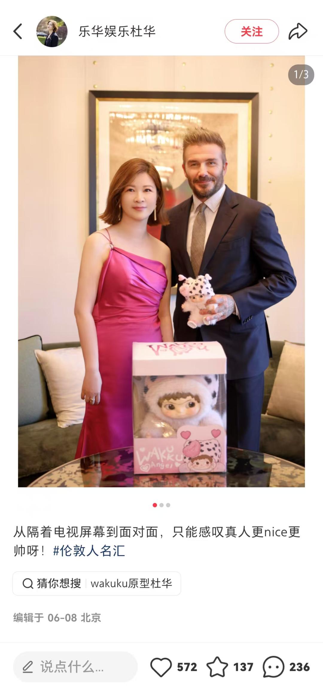 有着深厚的娱乐营销经验和丰富的明星资源,杜华是WAKUKU明星营销的主力推行者。点开杜华的个人小红书账号可以明确感受到这点。4月6日,在宣传电影《向阳花》时,她晒出和主演赵丽颖的合作,赵丽颖怀抱WAKUKU娃娃;4月28日,她又晒出在华表奖现场与其他艺人的合照,黄渤和惠英红手中都拿着最新款的WAKUKU;就在最近,杜华与贝克汉姆合影,照片里贝克汉姆同样手持WAKUKU。这是新方法带来的新能力要求下,赋予新玩家的机会。