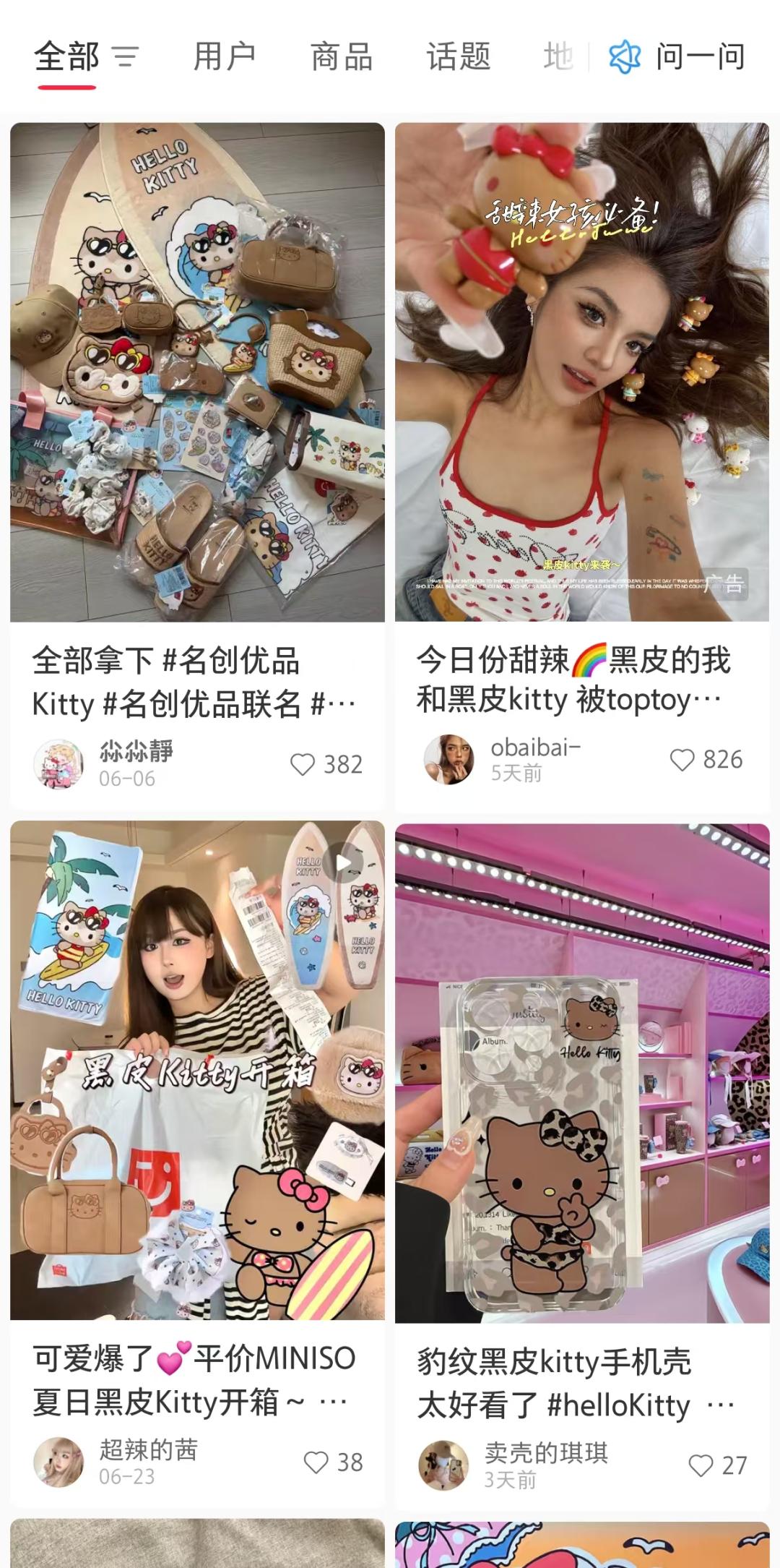 不仅是LABUBU,HelloKitty也是这一风潮的受益者。因为设计与MIU MIU的适配度,长腿Kitty在二级市场一货难求,而原本作为夏威夷限定的黑皮Kitty也因为其和甜辣风的呼应,受到野兽派、名创优品等品牌青睐,在过去两个月先后推出联名商品。野兽派在联名设计中,通过和豹纹元素的结合,进一步放大的黑皮Kitty的甜辣属性;而尽管联名产品中没有最受欢迎的挂件,但名创和黑皮Kitty的联名也以包、饰品等穿搭相关单品为主。