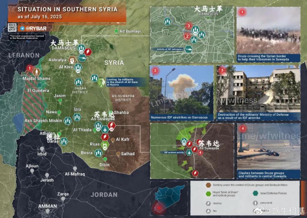 到 16 日日终时分,可以确定朱拉尼部队已经重新拿下了苏韦达省政府大楼、苏韦达省警察总部等之前被德鲁兹民兵夺取的据点,城市巷战已经发展到苏韦达东部地区。