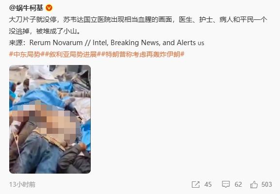 16 号整整一天时间,电报群组里到处都是朱拉尼部队开屠德鲁兹人的小视频,几十个不带重样的。到了晚上(叙利亚时间下午),朱拉尼部队终于拉了个大的——据报,朱拉尼部队在苏韦达国立医院,屠杀了所有医生、护士、患者、陪护平民,杀的尸横遍地血肉横飞,充分展现出了朱拉尼部队教权派恐怖分子的 " 风采 "。