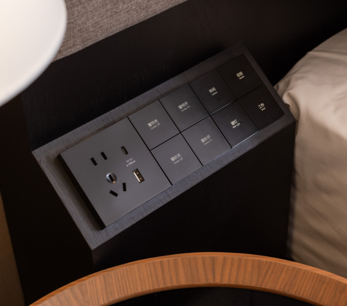 有多少人觉得传统墙插难用?现在手机电脑充电器都很大,往插座里插不容易,但是掉下来却很简单,看似一个小问题,但又有多少人尝试解决过呢?城际床头面板用的是斜45度的设计,这样不仅插头更牢,而且躺在床上就能看到面板信息。