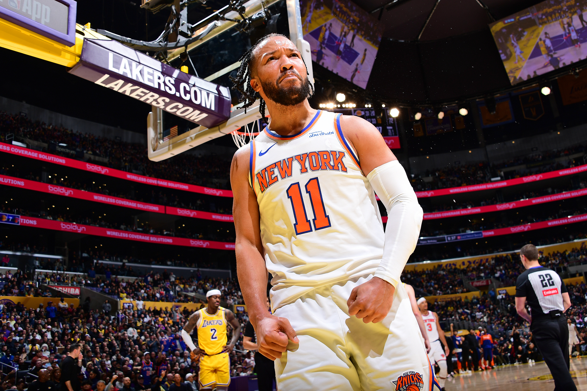 这是三天前尼克斯与湖人比赛的场景,当扭伤脚踝的布伦森上演“英雄归来”,现场球迷也送上了最大的敬意。毕竟在崴脚之前,布伦森一个人抡了41分钟,26投13中砍下37分10助攻4篮板。