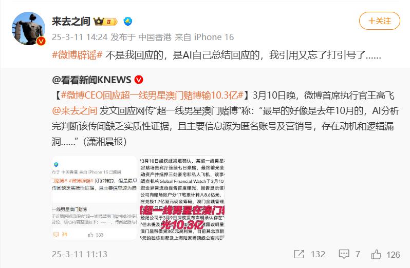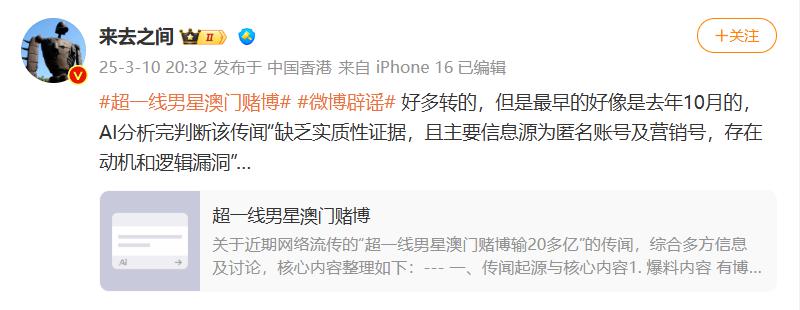 此前,微博首席执行官王高飞(@来去之间)发布了 AI 总结回应的 " 超一线男星澳门赌博 " 传闻,称 " 最早的好像是去年 10 月的,AI 分析完判断该传闻缺乏实质性证据,且主要信息源为匿名账号及营销号,存在动机和逻辑漏洞 ……"