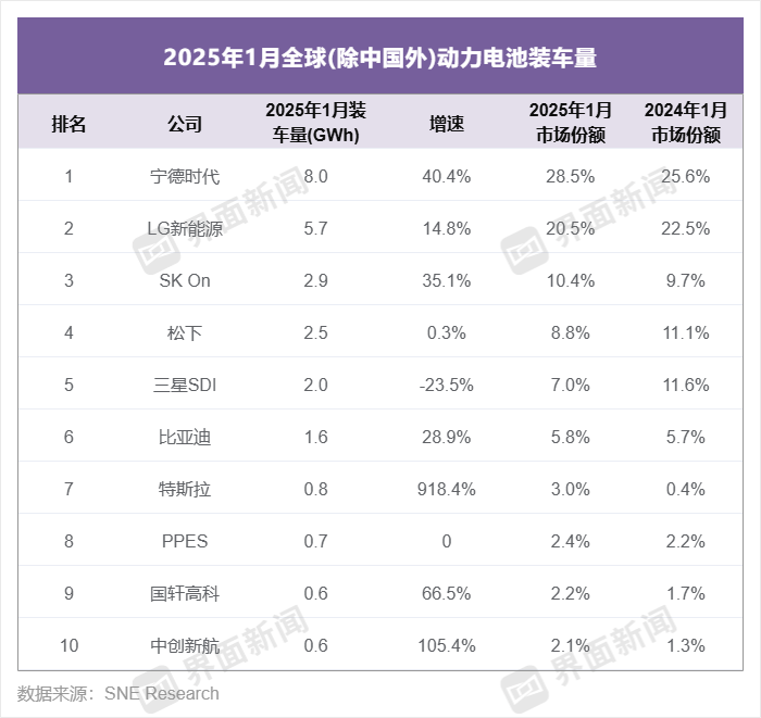 在除中国外全球动力电池装车前十榜单中,表现最亮眼的非特斯拉莫属。