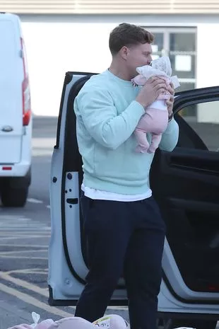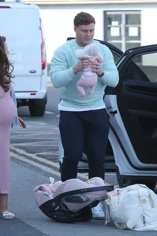 这位备受喜爱的电视明星身穿粉色针织中长裙,背着他们的包和医院行李箱走向汽车,而未婚夫马修则抱着他们最珍贵的宝贝——他们最新的宝贝。