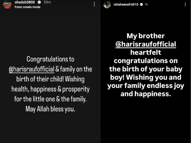 巴基斯坦快速投球手哈里斯·拉乌夫和他的妻子穆兹娜·马苏德·马利克迎来了他们的第一个孩子,一个男孩。拉乌夫的队友沙欣·沙阿·阿夫里迪和沙达布·汗在社交媒体平台上分享了这一消息。