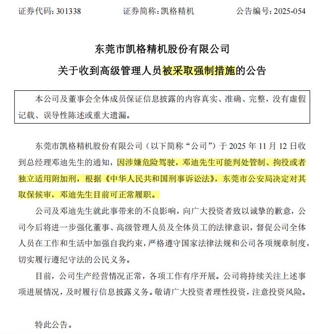 每经编辑|许绍航11月12日晚,凯格精机发布公告,公司收到总经理邓迪通知,因涉嫌危险驾驶,邓迪可能判...