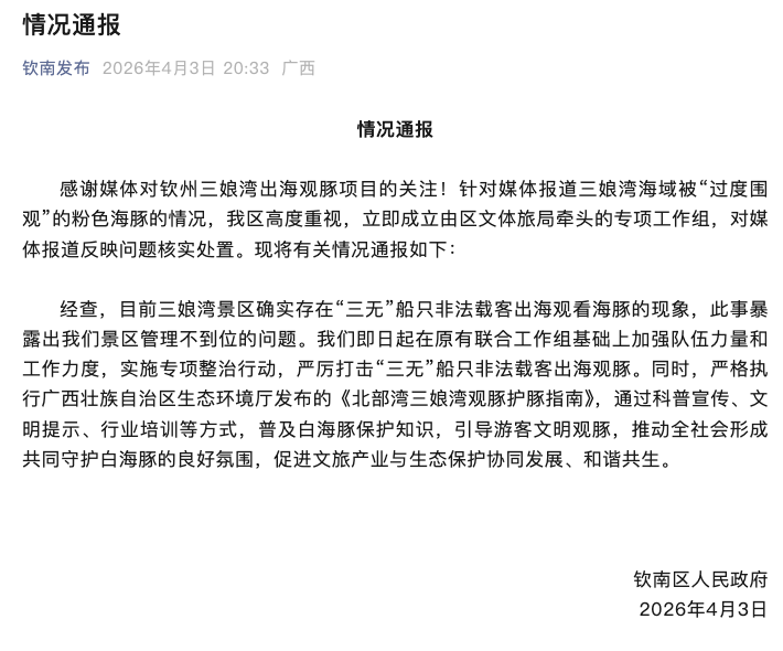 4月3日,广西钦州钦南区人民政府发布情况通报:针对媒体报道三娘湾海域被“过度围观”的粉色海豚的情况,...