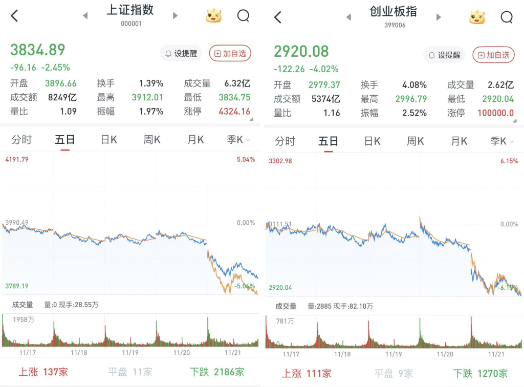 A股三大股指11月21日集体低开,沪指直接跌破3900点。早盘快速下跌,午前跌幅略有收窄。午后短时震...