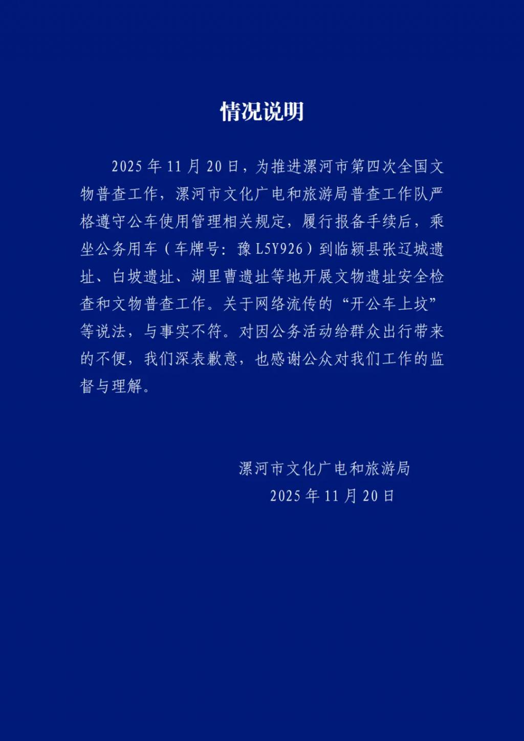 11月20日,漯河市文化广电和旅游局发布情况说明:为推进漯河市第四次全国文物普查工作,漯河市文化广电...