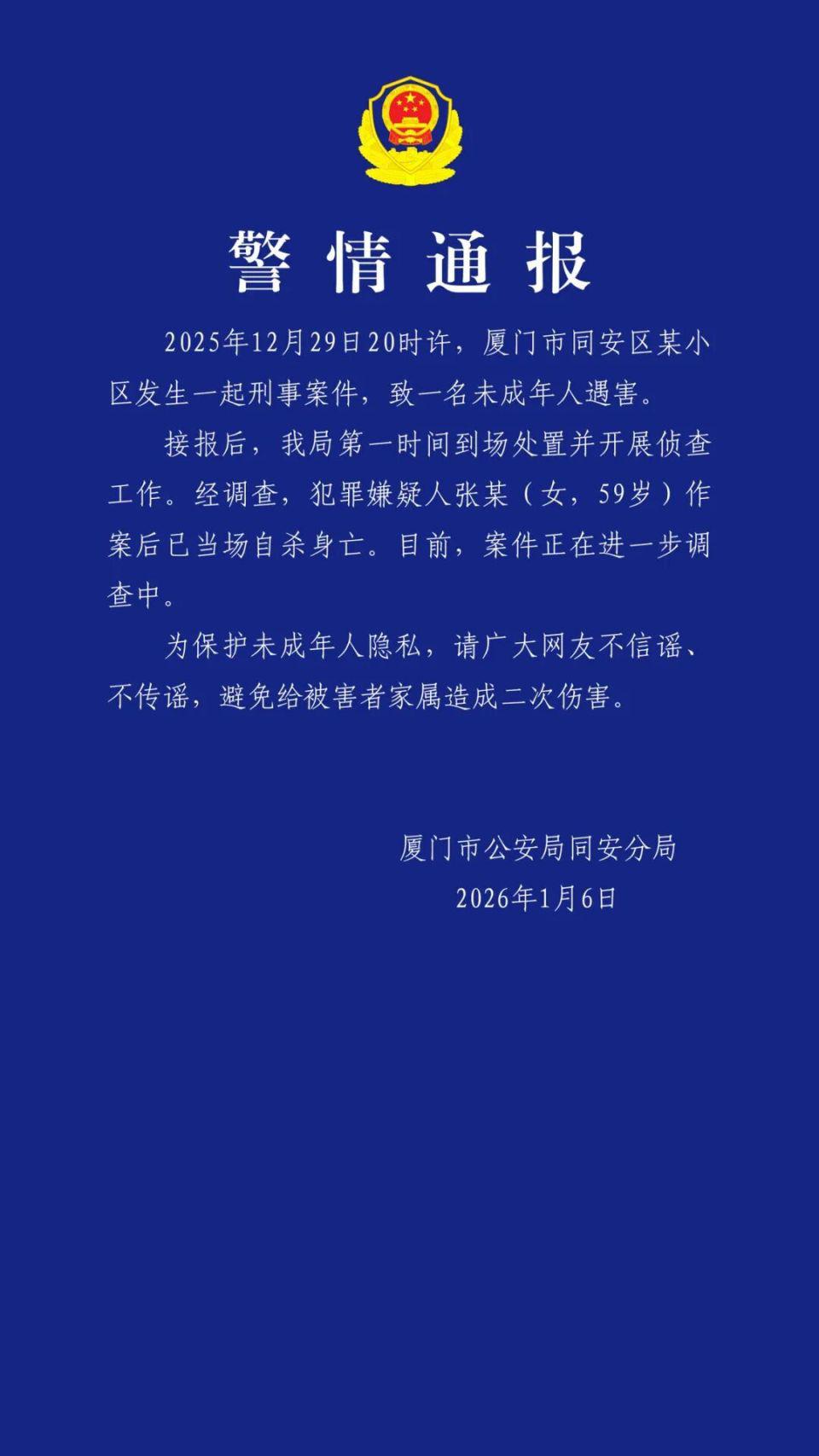 厦门警方通报“一未成年人遇害”:犯罪嫌疑人已自杀身亡科学