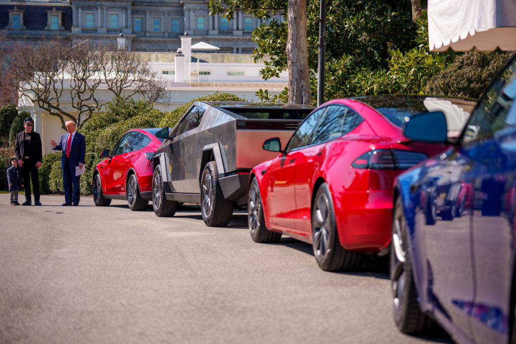 2025年3月11日,华盛顿特区白宫南草坪上,唐纳德·特朗普总统在白宫高级顾问、特斯拉和SpaceX首席执行官埃隆·马斯克和他的儿子X Æ a - xii的陪同下,在一辆特斯拉Y型车、一辆赛博卡车和两辆S型车旁边讲话