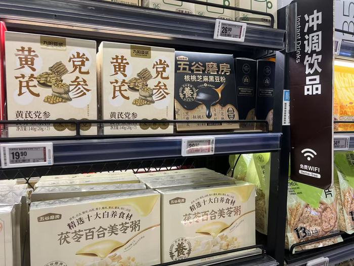 事实上五谷磨房的核心产品仍然是冲泡粉,比如核桃芝麻黑豆粉、益生元黄薏米谷物代餐粉等等,在盒马这样的线下渠道也有出售,其核桃芝麻黑豆粉单价在29.9元左右。同时,该品牌也用各种礼盒装切入送礼市场,在某电商平台旗舰店,其“团圆三宝食养礼盒”售价在179.8元左右。不过在这个赛道,其竞争对手也包括九阳豆浆、南方黑芝麻、江中食疗这样的传统品牌。
