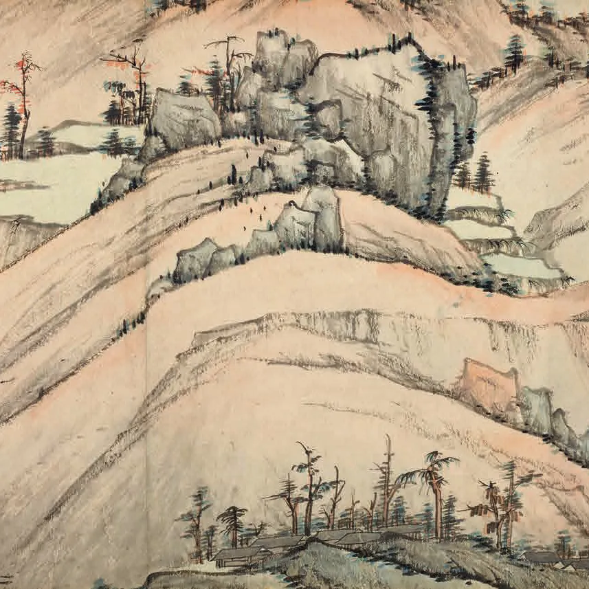 祝昌(明末清初)师承渐江,却兼取黄公望、程正揆之法,其《江山胜览图》作于1662年,以浅绛设色绘丘壑坡陀,溪山映带。