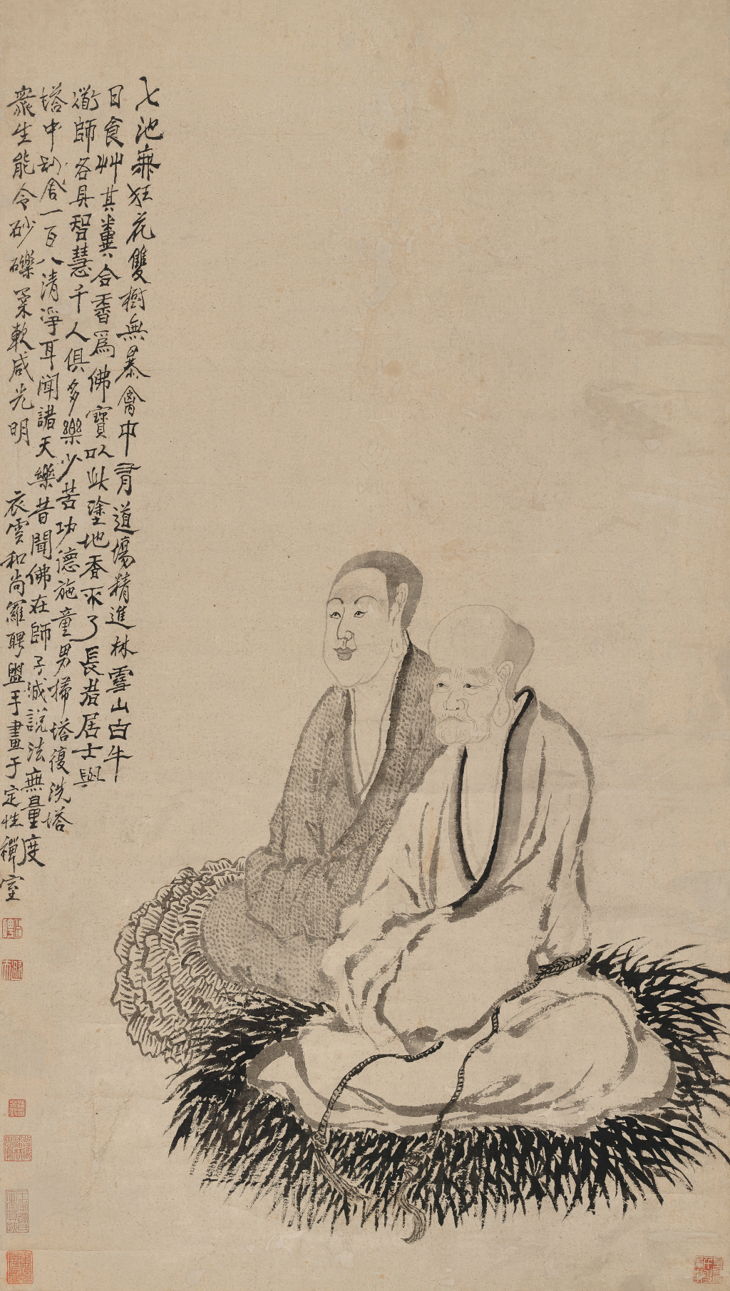 罗聘(1733-1799)为“扬州八怪”之一,其《墨笔罗汉图》以水墨纸本立轴绘二罗汉端坐蒲草之上,一白衣素褐,一着灰色僧服,皆瞪目远视,神情肃穆,法相庄严,对之令人生敬。上方空着所有,益显佛陀气象之高俨古拙。笔墨不多,而精神郁勃充斥于画面,是罗聘传世佛画中之精品。