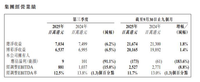 11月12日,澳门博彩控股有限公司(澳博控股,00880.HK)发布截至2025年9月30日止的第三季度业绩报告。