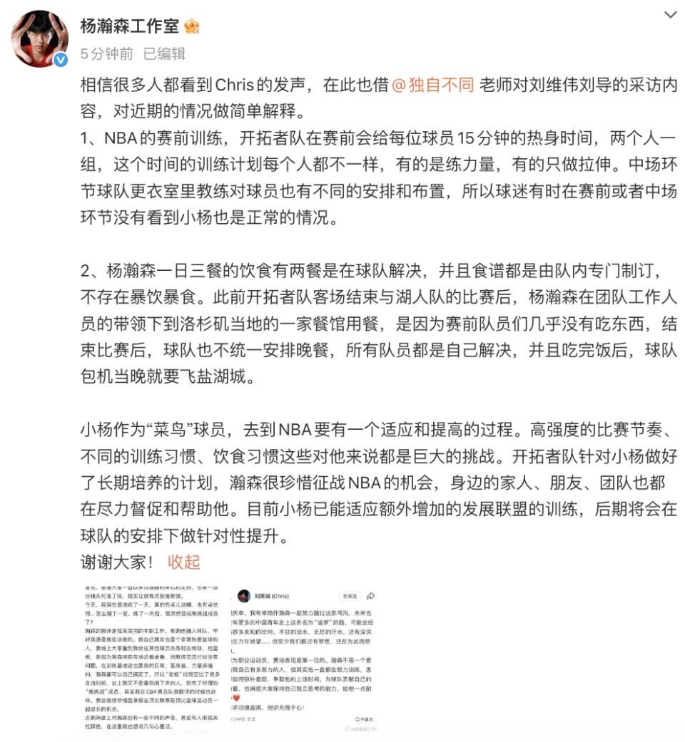 11 月 5 日,据白鹿视频报道,@杨瀚森工作室 发文回应杨瀚森近期争议。