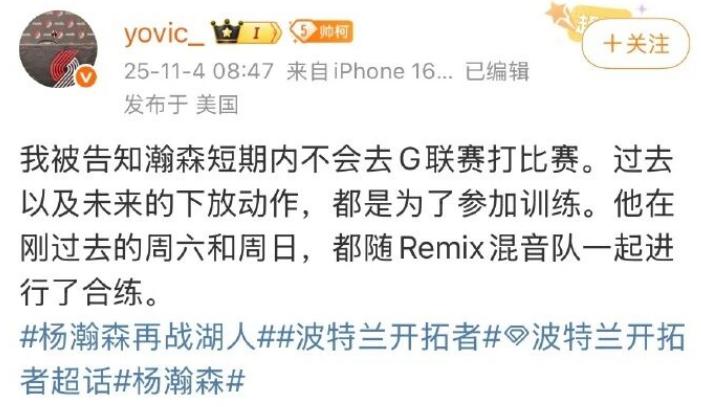 11 月 14 日,@波特兰开拓者队发文:" 官宣:波特兰开拓者队已将杨瀚森派至发展联盟混音队。杨瀚森将在北京时间本周六对阵山谷太阳队和下周一对阵南湾湖人队的比赛中出场。 "