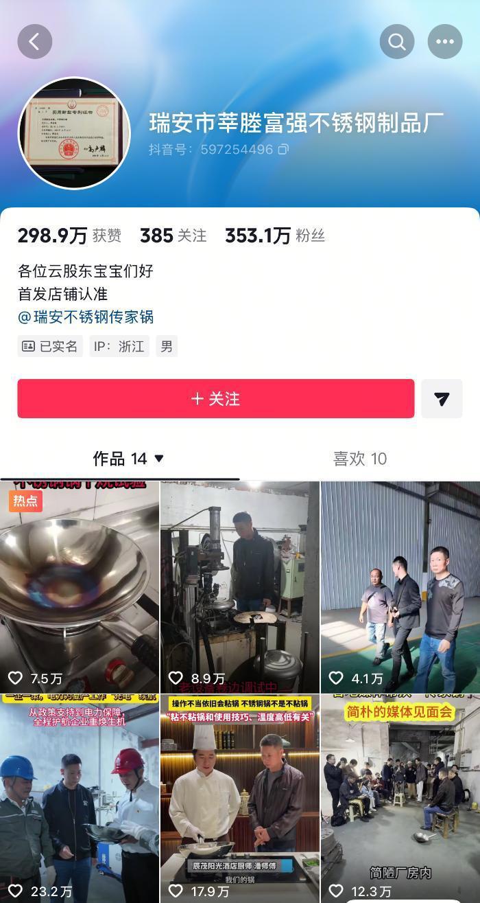 很快,网友根据锅手柄上的专利号,找到了这口锅的原生产厂家瑞安市莘塍富强不锈钢制品厂 ( 以下简称 " 富强厂 " ) 。厂家本已停产多年,但爆红后其抖音账号粉丝在 10 天内从几百飙升至 300 万以上。在广大网友的 " 求锅 " 号召下,老板傅克萍开设了抖音店铺,等正式复工复产测试好锅品后,再上线售卖。