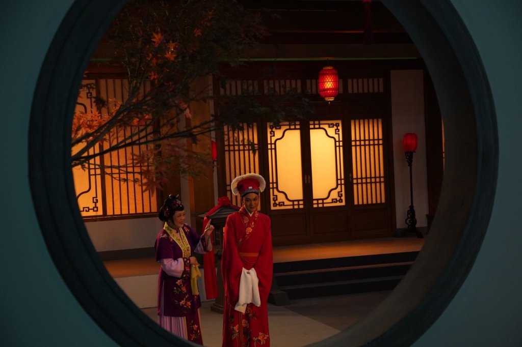 《双蝶扇》的视觉呈现亦极具匠心。外部环境的山水迢递、内部环境的园林造景、服化道等具体细节,共同营造出“移步易景、唯美精致、意境深远”的东方美学,可谓人在画中,充分彰显了“儒林”戏古雅的文学美感。同时,影片精心借鉴了国画、国乐等传统艺术,赋予了影片山水的意境美、舞美设计的简约美、服装的典雅美、音乐的旋律美、唱腔的韵味美。