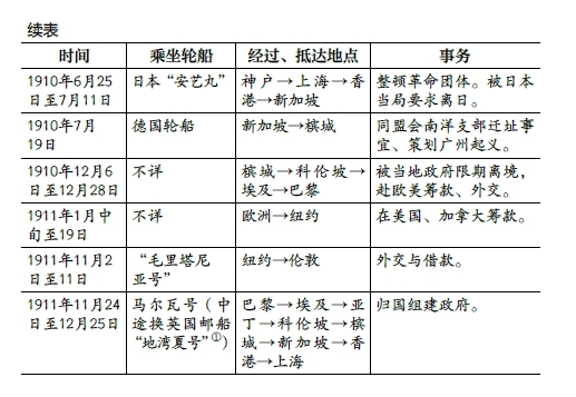 由于个别起程及抵达目的地时间点不详,很难精确统计孙中山于1905年6月至1911年12月间在航船上的时间。如果粗略统计一下,则有近300天。这意味着,这6年多时间里,他有约1/7的时间在航船上思考与筹划革命。或许可以将他这一个特殊的革命历程称之为“船板上的革命”。