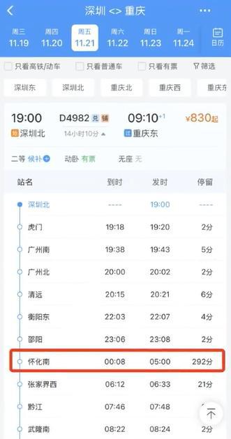 以 11 月 21 日的 D4982 次列车为例,其到达怀化南站的时间预计为次日 00:08,而发车时间为 5:00,停留时长预计为 292 分钟,近 5 个小时。
