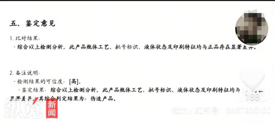 11 月 13 日,网友 " 嘟嘟囔囔 " 在其另一个账号 " 馬先生 " 中发布了一张截图,截图上只有 " 鉴定意见 " 这部分内容,其中 " 比对结果 " 一块写着:综合以上检测,此产品瓶体工艺、批号标识、液体状态及印刷特征均与正品存在显著差异。综合判定结果为 " 伪造产品 "。