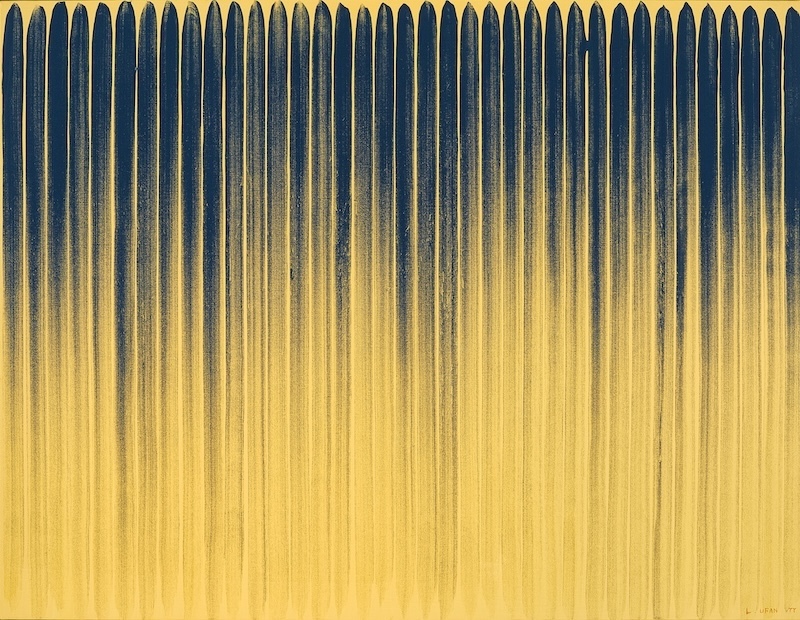 与赵无极异曲同工,韩国艺术家李禹焕以其1977年的《从线》呈现“物派”艺术的精髓。作品以矿物颜料与胶水在画布上反复拖曳成垂直线条,通过节奏、痕迹与呼吸般的秩序,使绘画成为一种“行动与时间”的记录,体现艺术家对东方哲学与物质关系的持续思考。