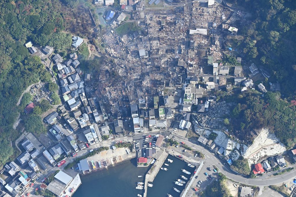 当地时间2025年11月19日,日本大分县大分市,大分县政府公布的航拍图显示,佐贺关渔港附近居民区发生火灾。视觉中国 图