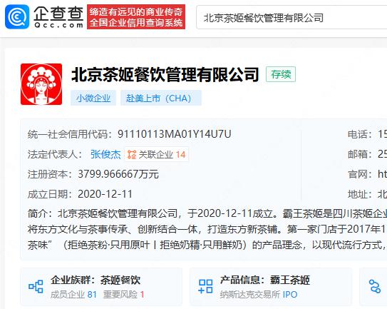 企查查 APP 显示,北京茶姬餐饮管理有限公司成立于 2020 年 12 月,注册资本约 3799.97 万人民币,由 CHAGEE INVESTMENT PTE.LTD. 全资持股。