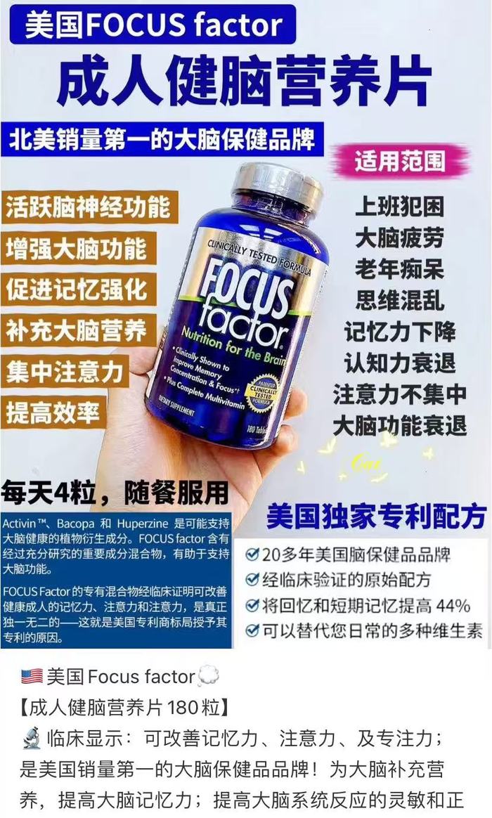 比如,号称“北美销量第一的大脑保健品牌”——美国FOCUS FACTOR成人健脑营养片。社交媒体上,这款产品被认为能够活跃脑神经功能、增强大脑功能、促进记忆强化、补充大脑营养、集中注意力、提高效率。