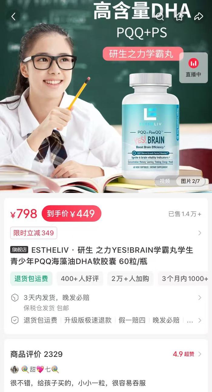 又比如,“研生之力(ESTHELIV)学霸丸”。在小红书的购买海报业上,该产品被指具有“高含量脑黄金DHA+PQQ+PS”(二十二碳六烯酸+吡咯喹啉醌+磷脂酰丝氨酸),能帮助“轻松记、高效率、好视力、长专注、快思维、好心态”。目前,在小红书跳转的购买链接中,60粒/瓶的产品到手价为449元。