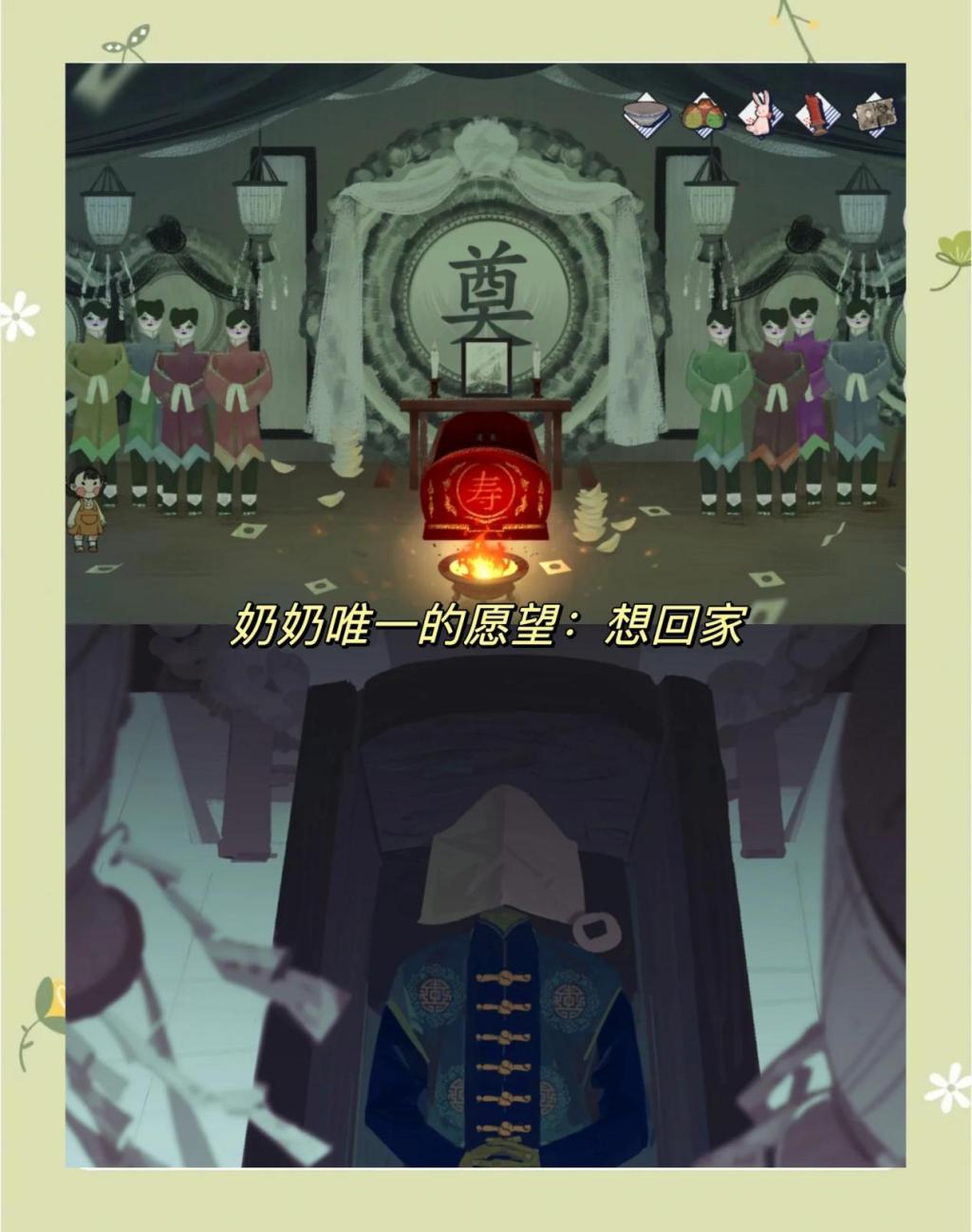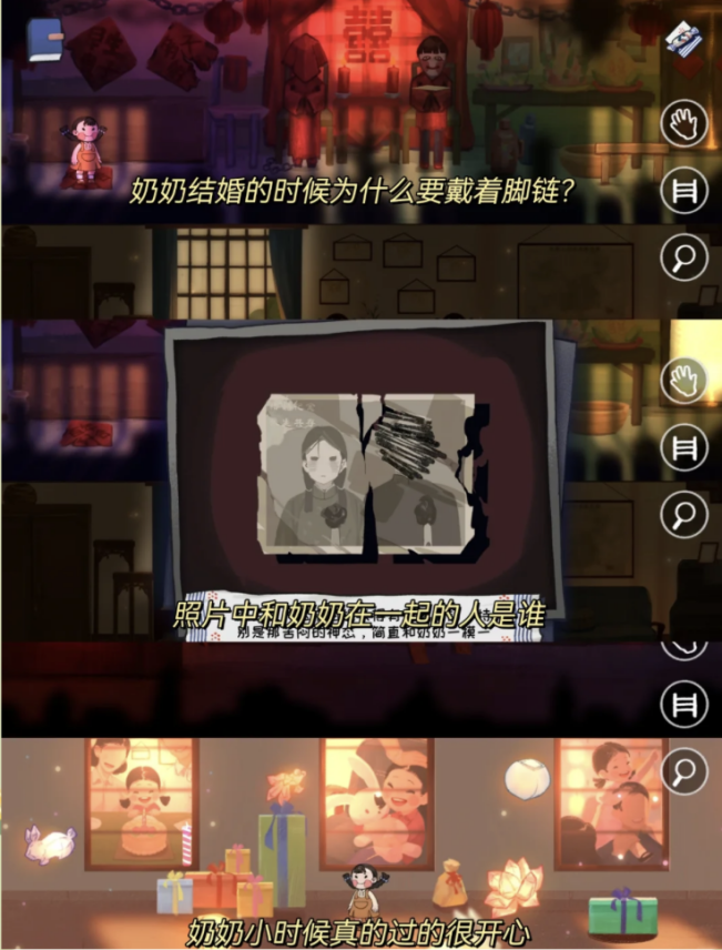 这种双层空间的叙事结构,构成了游戏最核心的悖论:同一个生命,被撕裂成两个完全不同的版本。上层是“本该有的人生”,下层是“实际发生的人生”。在游戏中,奶奶没有台词,但游戏的文本已经说完了她的双重人生。两层空间的探索实际上在奶奶不同时间的褶皱中穿行,见证一个女性如何从“囡囡”变成“媳妇”变成“奶奶”,从欢喜的少女变成忧郁的不言者,从拥有名字变成失去名字。