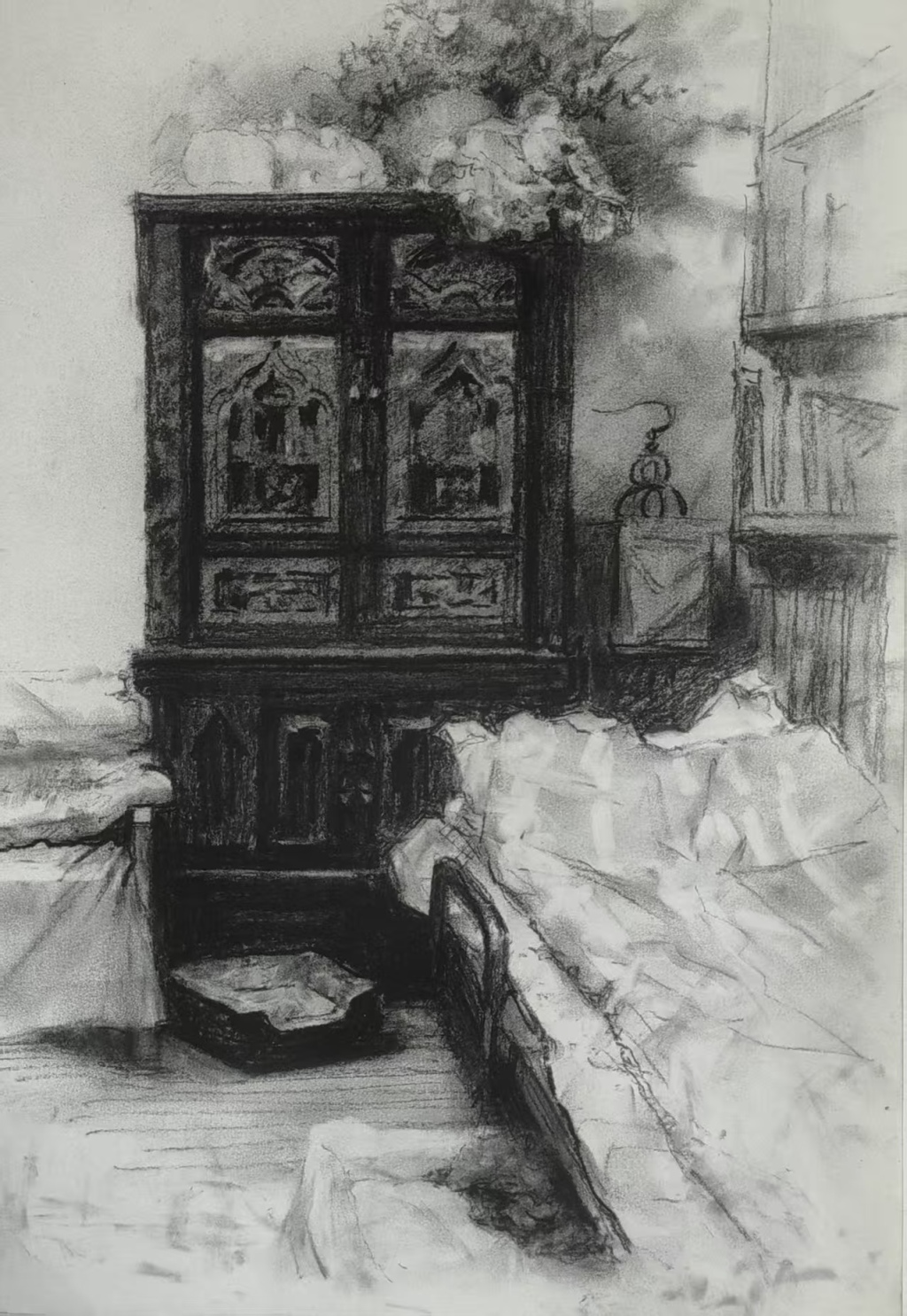 杨建勇认为,陈伟德的素描带着浓郁的法式浪漫。他痴迷于描绘宅居空间的光影变换,巴黎的家与上海的家是他永恒的题材。“晚上灯光下的物品,会有种别样的氛围,”陈伟德说,“一切色彩都变得多余,黑白那样的简单和纯粹……光与阴影之间的碰撞,正是场景素描写生的魅力所在。”他的画室不只在画架前,更在旅途的速写簿上,炭条、铅笔、水笔记录着流动的人生。