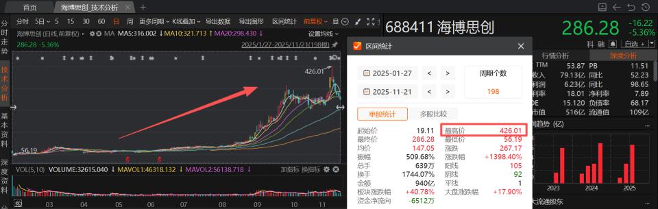 而在全球储能行业高景气与头部企业示范效应下,海博思创凭借扎实的储能业务布局同样表现亮眼,其股价也迎来显著暴涨。储能系统集成龙头海博思创成立于 2011 年,实控人为张剑辉、徐锐夫妇。今年 1 月,海博思创正式登陆上交所科创板,年初迄今,海博思创股价较发行价 19.38 元累计最大涨幅为 2098%。受储能市场需求强劲驱动,海博思创业绩表现突出,第三季度归母净利润达 3.07 亿元,同比激增 872.24%。海博思创方面表示,其紧抓国内储能市场快速发展机遇,依托多年积累的市场、技术和研发竞争优势,在国内市场占据较高份额,同时加速拓展全球市场,推动营业收入实现快速增长。海博思创方面此前透露,2025 年增长动力主要来自三方面:一是国内储能规模长期增长趋势明确,储能逐步形成独立盈利模式;二是海外市场快速扩张,尤其以北美、欧洲和东南亚等市场为核心;三是新应用场景拓展,大功率充电与储能结合、数据中心配储、柴发替代等场景需求预计快速增加。